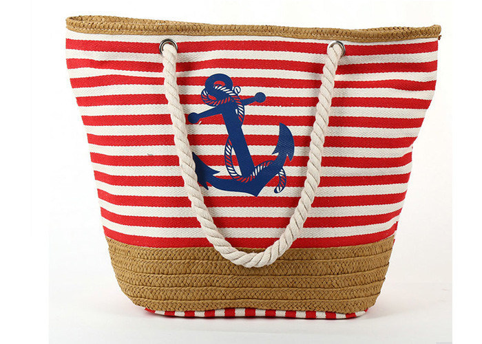 Navy Style Straw Weave Non Woven Polyester Bags With Rope Handles Zipper Closure